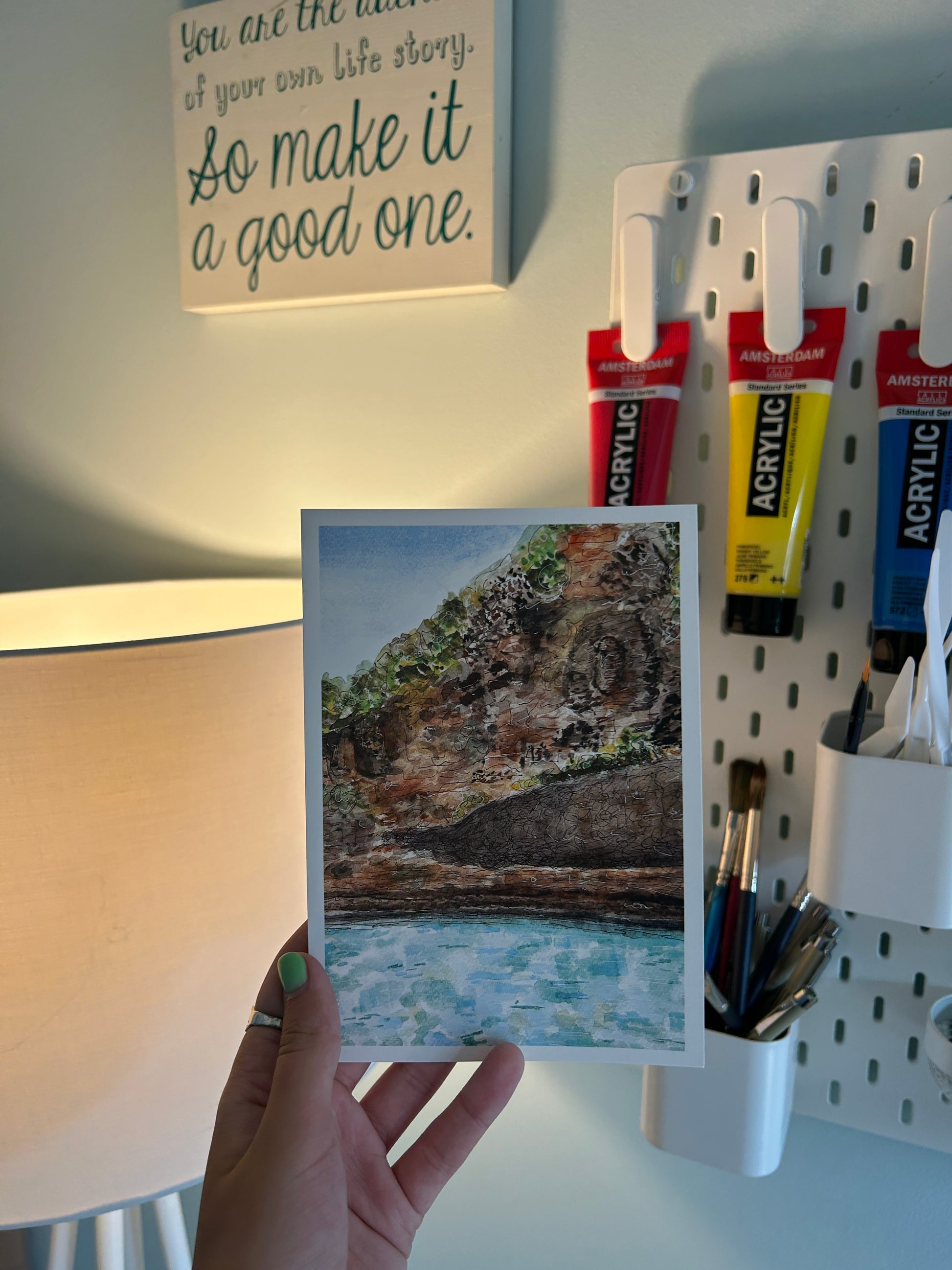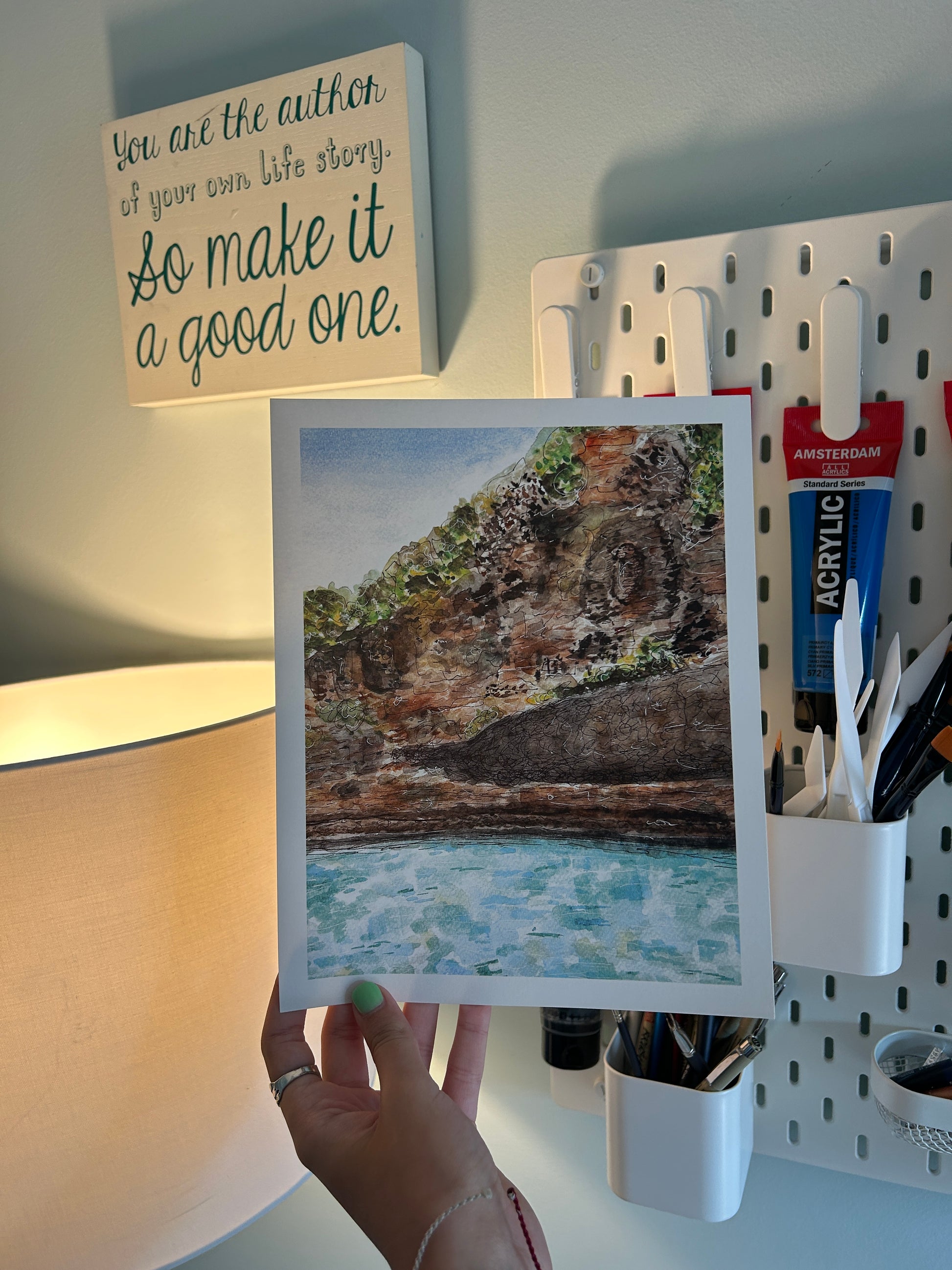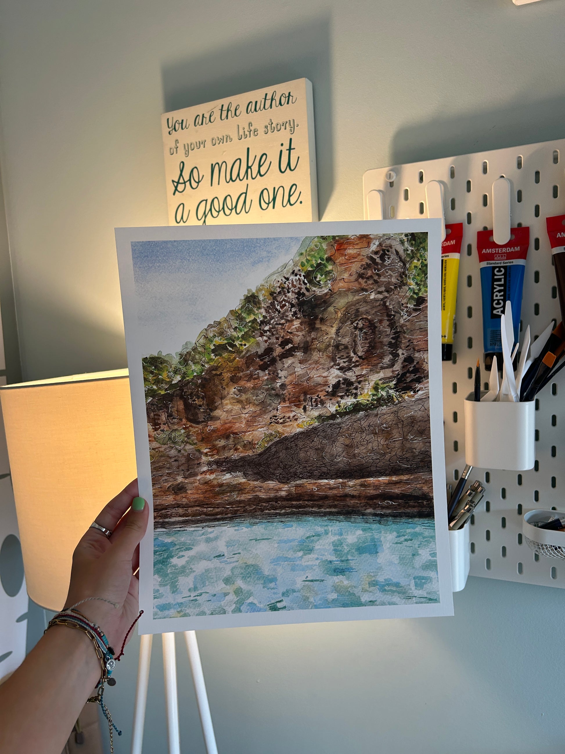 similar to my other painting, "pigs can swim!" this painting took inspiration from a photo i took on the same trip to the bahamas. this is one of my favorite paintings- it's vibrant and the cliff and water is a fine work of art by mother nature.