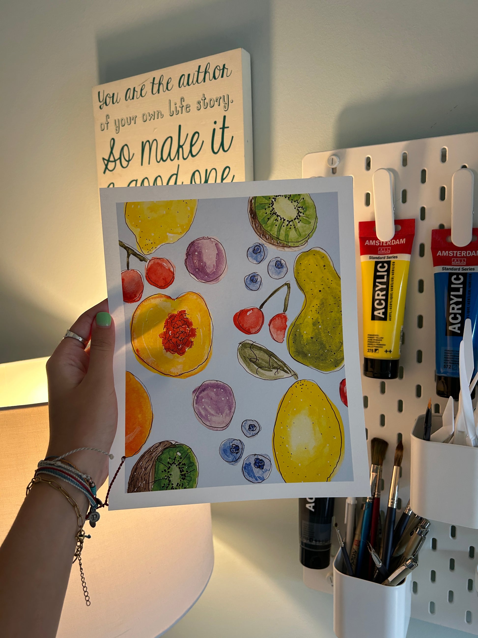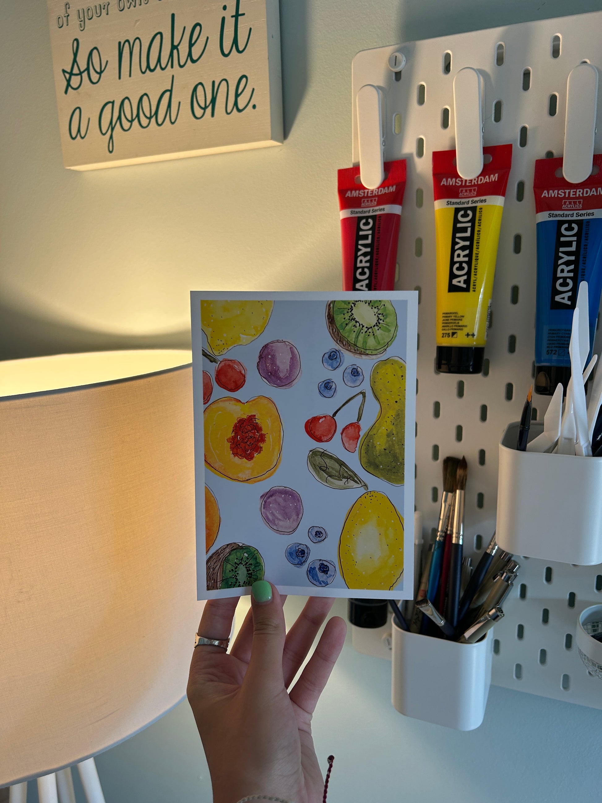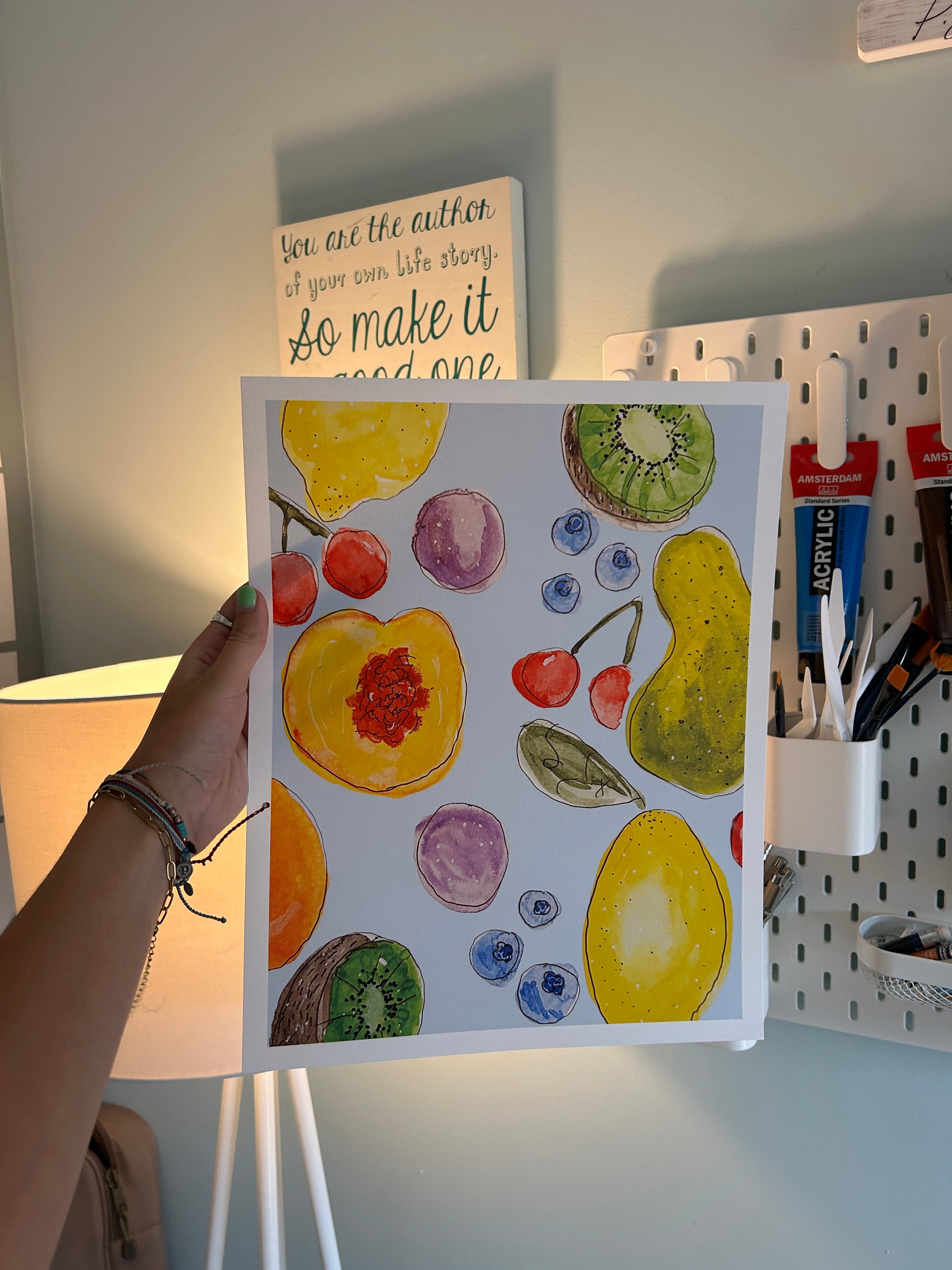 enjoy this pattern of watercolored fruits with a baby blue background. from cherries to pears, the colors on this print have a fun contrast from one another to put in your kitchen (or room. or bathroom. i don't know where you're putting this).