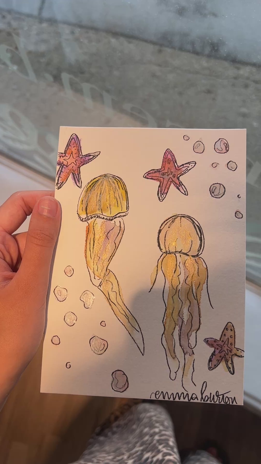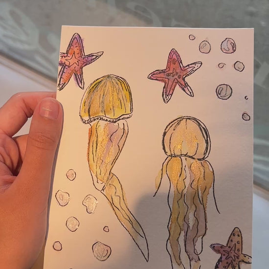 this is a small, sparkly, painting of a underwater scene-featuring starfish, jellyfish, and bubbles.